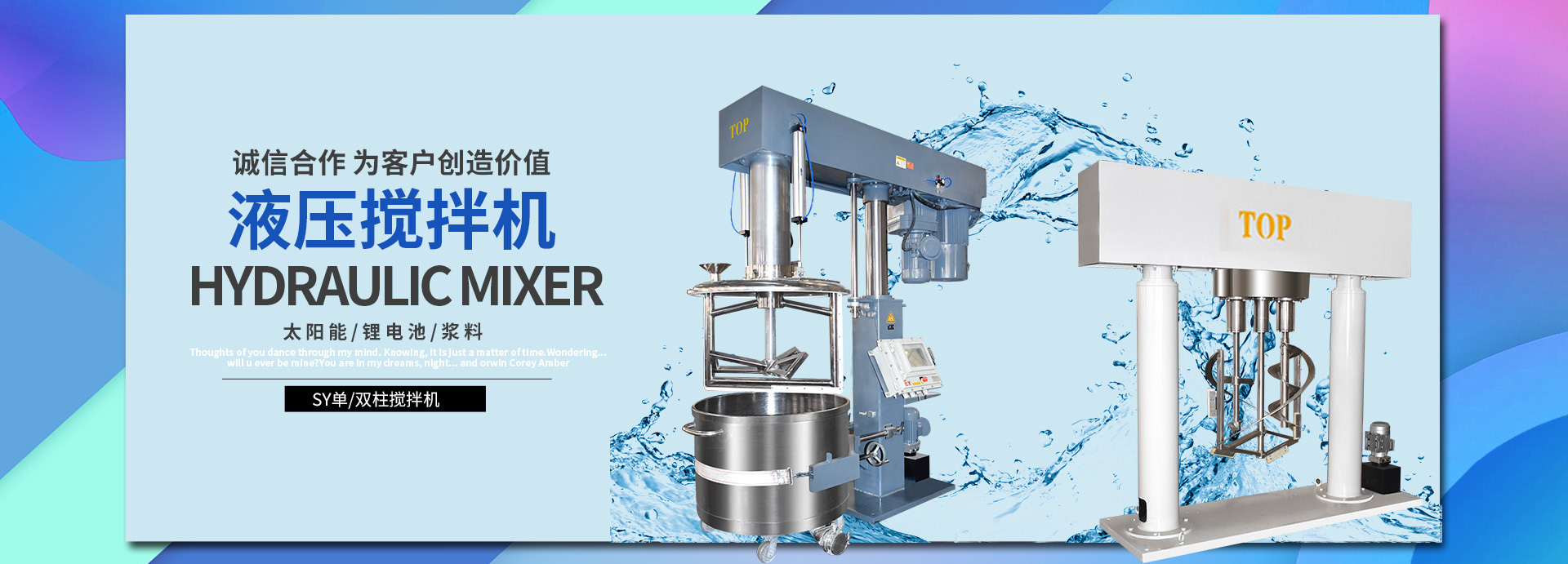 无锡托普搅拌设备有限公司成立于2003年,生产基地位于长三角经济区,工业城市无锡市。是新加坡Matchmetal Pte.Ltd旗下,专门从事流体和粉体及浆料的混合搅拌设备的研究开发以及设计生产的技术型公司。可为客户提供优质可靠经济的产品以及一体化、自动化、智能化的成套设备一条龙服务。公司专门设有粉体浆料事业部、生物质能源环保事业部、食品医药事业部和精细化工搅拌事业部。本公司有一批经验丰富的工程师,有丰富的行业工程经验,生产实行5S管理,通过ISO9001质量管理体系认证,有能力为客户解决最棘手的搅拌混合问题。